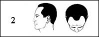 Sınıf 2 : Androgenetik saç dökülmesi : Kellik olarak nitelendirilebilinecek bu saç dökülmesi şemasında saç çizgisi şakakları kısmen de olsa boş bırakacak şekilde gerilemiştir |