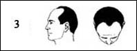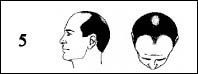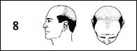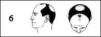 Sınıf 5: Androgenetik saç dökülmesi : ön saç çizgisindeki gerileme daha fazla, şakaklar daha da saçsızdır. Tepedeki saçsızlık ta daha fazladır. Saç tepe ile on saç çizgisi arasında ince bir şerit halinde bulunur. |