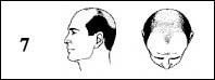 Sınıf 7 : Androgenetik saç dökülmesi : ön boş alanı ile tepe boş alanı birleşmiştir. ön ve tepe kısınlarında saç çok seyrek bir biçimde bulunur veya hiç buluınmaz. |